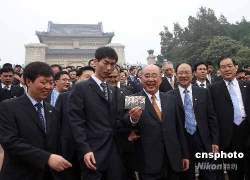 5月27日,中國國民黨主席吳伯雄率領的大陸訪問團拜謁中山陵。圖為吳伯雄展示獲贈的當年訪問大陸時的照片。中新社發 盛佳鵬 攝