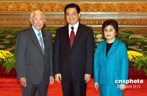 九月六日,中國國家主席胡錦濤和夫人劉永清在北京人民大會堂歡迎出席2008年殘奧會的各國貴賓。圖為胡錦濤夫婦與國際奧委會名譽主席薩馬蘭奇先生合影。中新社發 任海霞 攝