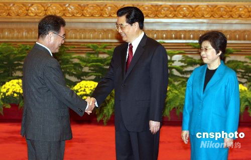 9月6日,國家主席胡錦濤夫婦在北京人民大會堂歡迎出席2008年殘奧會的各國貴賓。圖為胡錦濤夫婦歡迎日中友好協會會長加藤弘一先生。中新社發 任海霞 攝