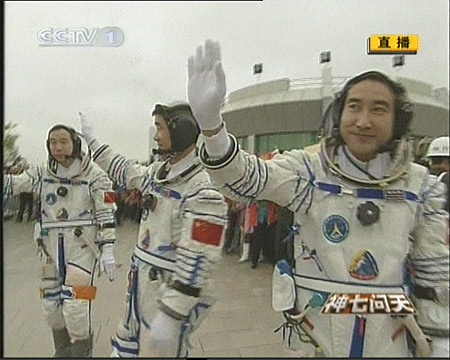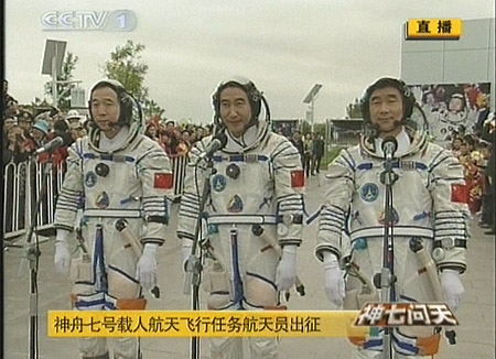 北京時間二十五日下午五時三十五分許,“神七”航天員乘組在中國酒泉衛星發射中心航天公寓“問天閣”廣場舉行出征儀式,身穿乳白色艙內航天服的“神七”三名航天員翟志剛、劉伯明、景海鵬受命出征太空。