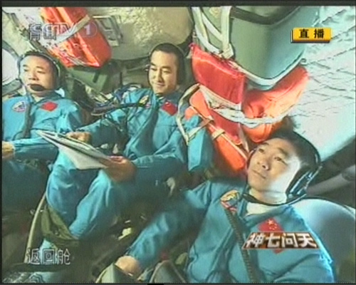 圖:三位"神七"航天員在返回艙與胡錦濤主席通話