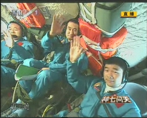 北京時間9月27日傍晚,在成功實施出艙活動后,航天員回到返回艙,與在北京航天飛行控制中心的中共中央總書記、國家主席、中央軍委主席胡錦濤進行天地通話。