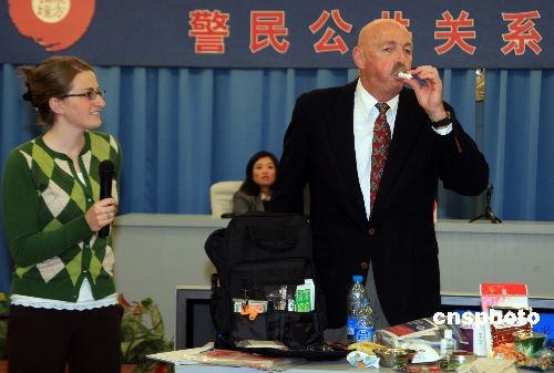 10月30日,來自美國猶他州公共安全部的資深培訓官特德·沃雷,在上海向基層警察講解“警民公共關系”,并詳細介紹美國警察在社區微笑招呼、應急防衛等“秘笈”。中新社發 潘索菲 攝