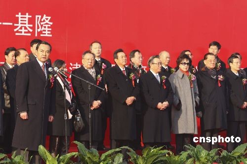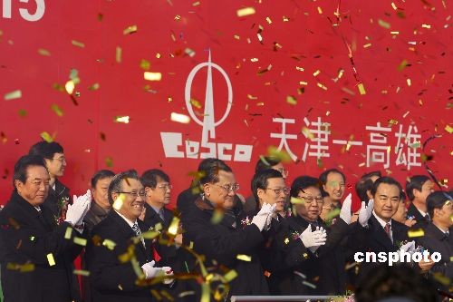 12月15日,海峽兩岸海上直航首航儀式在天津港舉行,中共天津市委書記張高麗、全國政協副主席鄭萬通、中國國民黨榮譽主席連戰、中國交通運輸部部長李盛霖、國臺辦主任王毅、海峽兩岸關系協會會長陳云林共同為首航船舶開啟按鈕。中新社發 盛佳鵬 攝