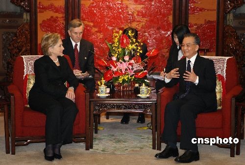 2月21日下午,中國國務院總理溫家寶在北京中南海紫光閣會見美國新任國務卿希拉里·克林頓。溫家寶在會見中引用《孫子兵法》中“同舟共濟”的成語,比喻中美兩國關系。中新社發 任晨鳴 攝