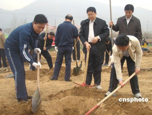 2009年3月21日,河北省及石家莊市黨政軍領(lǐng)導(dǎo)及省市四大辦公機(jī)關(guān)干部、部隊(duì)官兵1900人,在石家莊市鹿泉市山前大道韓莊生態(tài)林業(yè)基地,建設(shè)“省級(jí)領(lǐng)導(dǎo)紀(jì)念林”、“市級(jí)領(lǐng)導(dǎo)紀(jì)念林”、“駐石部隊(duì)紀(jì)念林”100多畝,栽植速生楊樹12000株,再一次掀起了省會(huì)造林綠化高潮。中新社發(fā) 俱凝搏 攝