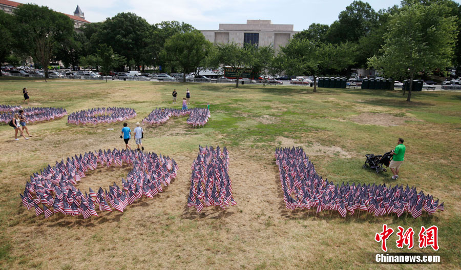 2010年6月30日,美國華盛頓,環保組織塞拉俱樂部的成員將數千面美國國旗插成“擺脫石油”(Freedom From Oil)的字樣,抗議墨西哥灣漏油事件。