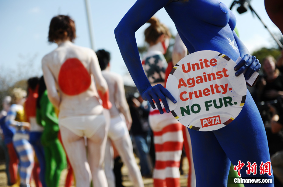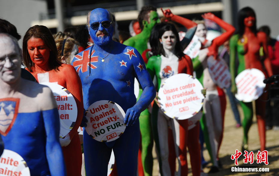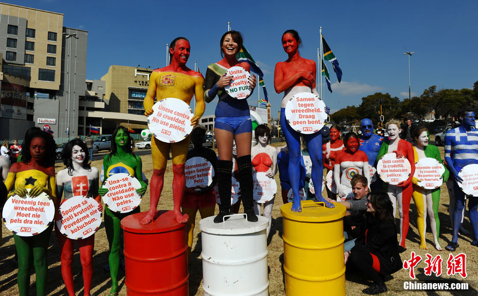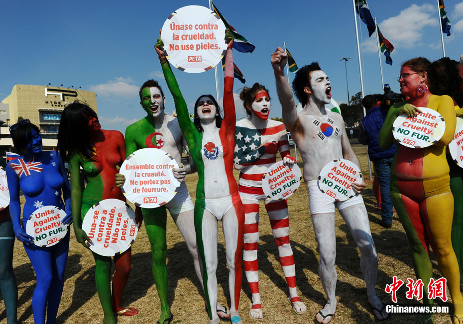 7月8日,南非世界杯賽場(chǎng)外,善待動(dòng)物組織(PETA)舉行彩繪游行。參與者身體上畫各國(guó)的國(guó)旗,并舉著寫有“團(tuán)結(jié)起來(lái) 抗議使用皮草”的標(biāo)語(yǔ)牌。