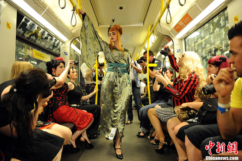 近日,模特穿行在德國柏林行駛的地鐵上進(jìn)行時(shí)裝表演。這場名為“地鐵上的貓步”的時(shí)裝表演充滿朋克和搖滾元素,已經(jīng)成為每年柏林春夏時(shí)裝周的一部分。