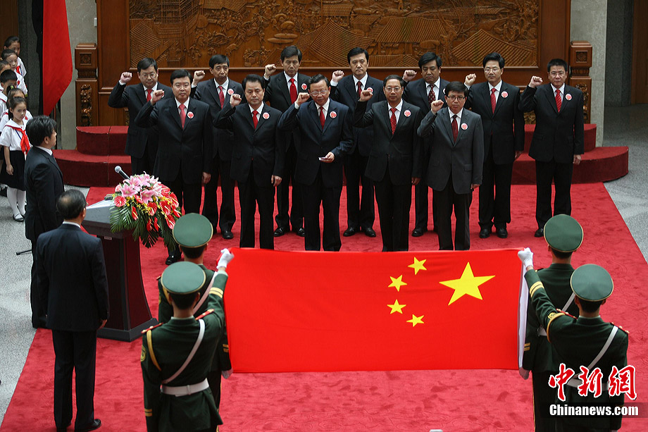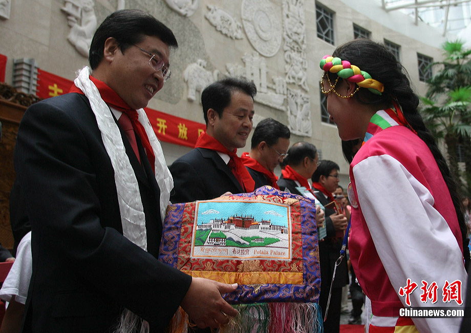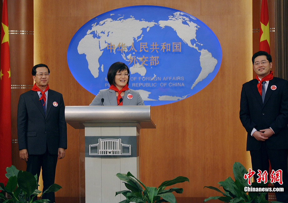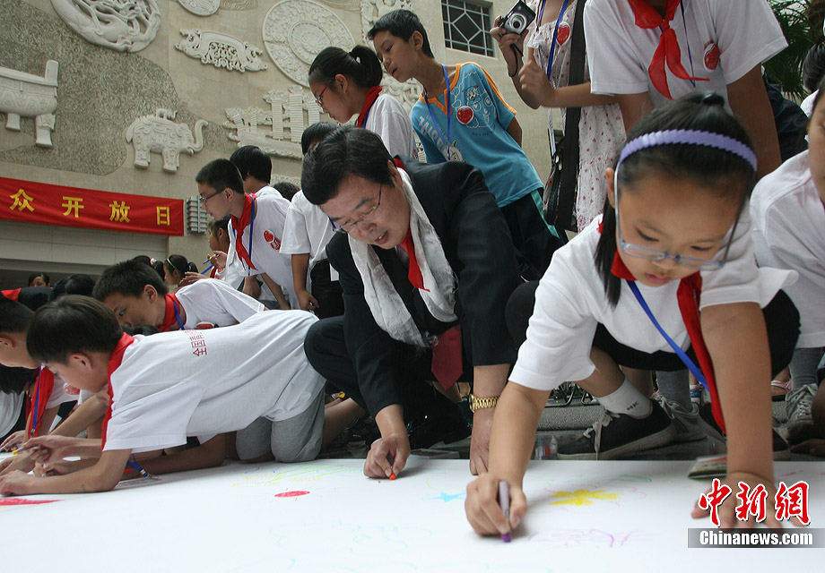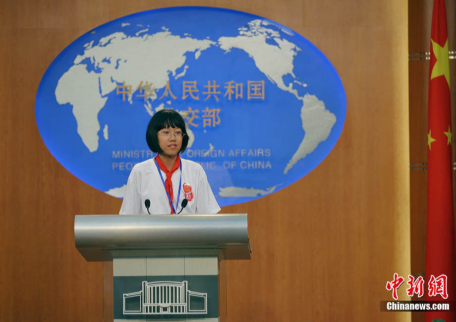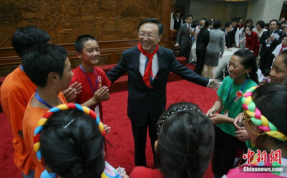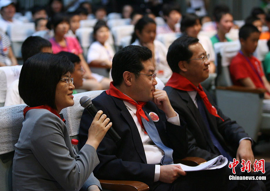7月17日,在外交部橄欖廳,外交部長楊潔篪勉勵玉樹震區小學生努力學習、重建家園。當日,外交部舉辦第八次駐外使節任職宣誓儀式暨外交部“祖國在我心中”主題公眾開放日。來自北京、玉樹、黑龍江、重慶等地的小學生參加了此次活動。中新社發 蘇丹 攝