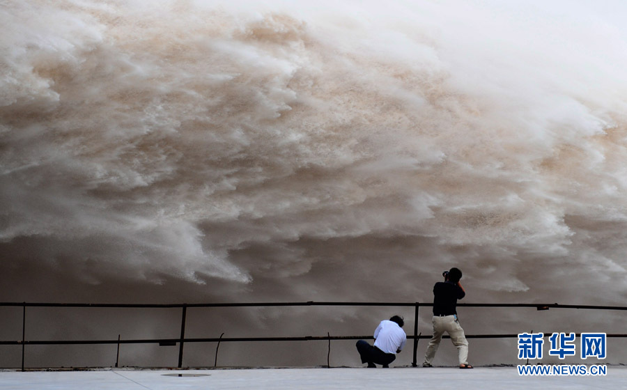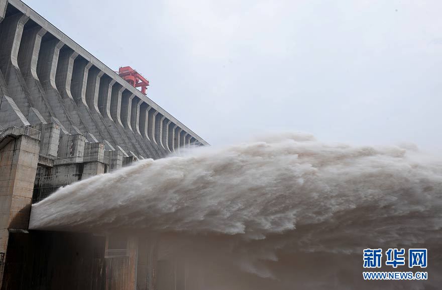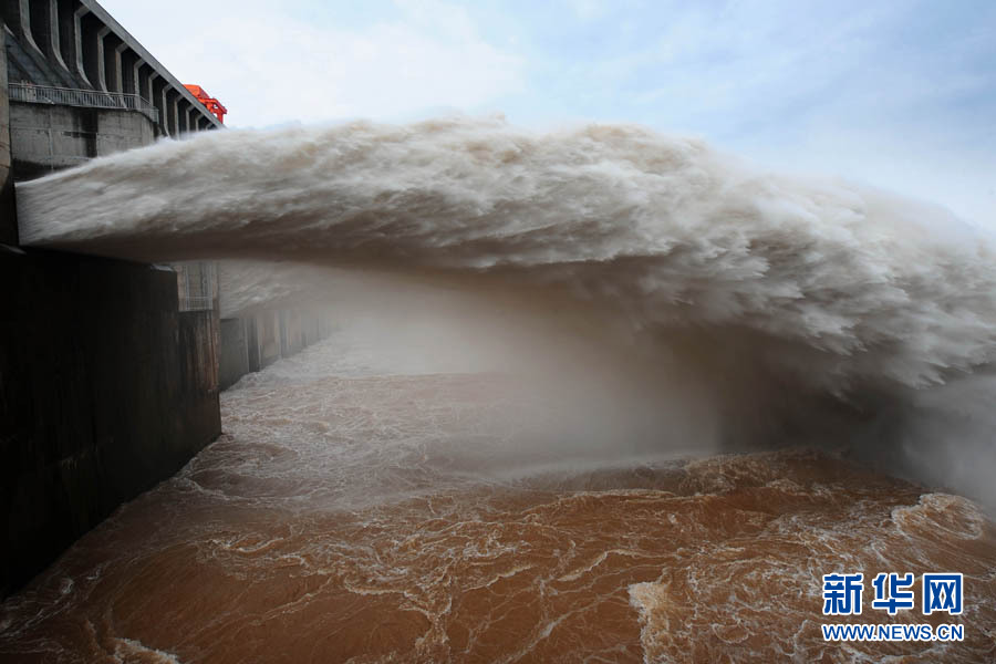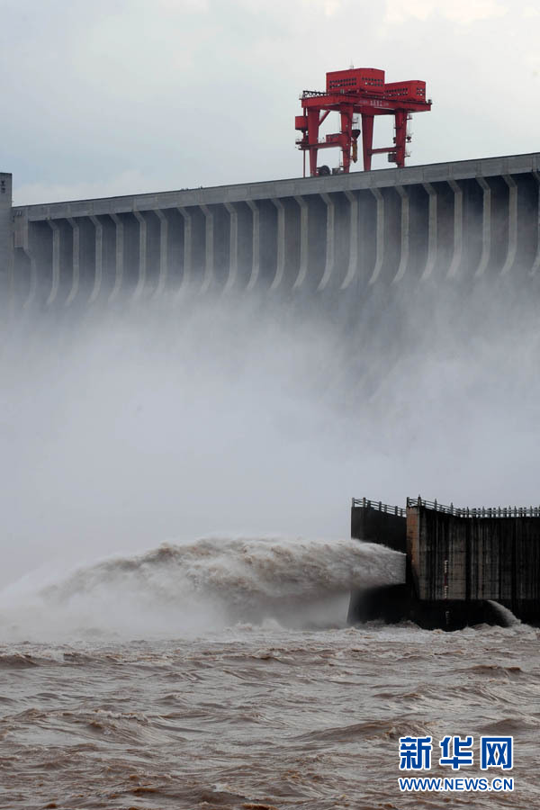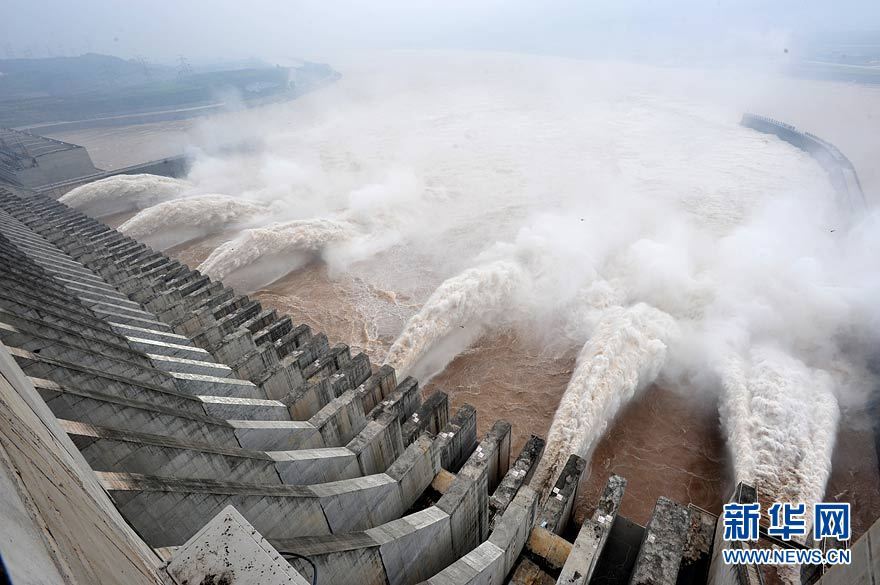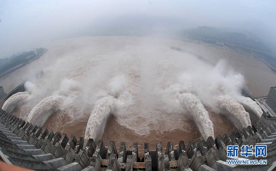 7月19日,三峽大壩開啟6個泄洪深孔和一個排漂孔泄洪。當日上午8時,三峽水庫入庫流量增至58000立方米/秒,再創今年入汛以來新高。長江三峽集團公司目前正按長江防總最新調度令,從19日10時起,再度加大泄洪力度,將出庫流量調高到40000立方米/秒,積極迎戰建庫以來的最大洪峰。據長江水文局最新預報,長江上游正在形成一場大洪水,洪峰流量將逼近70000立方米/秒。 鄭家裕 攝(圖片來源:新華網)