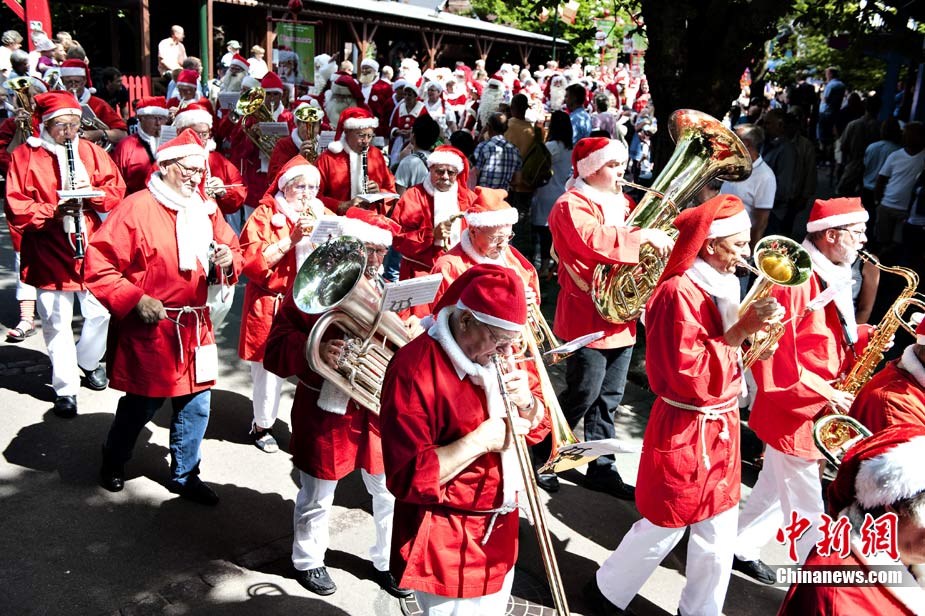 7月19日,丹麥?zhǔn)锥几绫竟瑏?lái)自世界各地的圣誕老人舉行游行,慶祝一年一度的世界圣誕老人大會(huì)。當(dāng)天,120多名來(lái)自世界各地的圣誕老人齊聚哥本哈根。