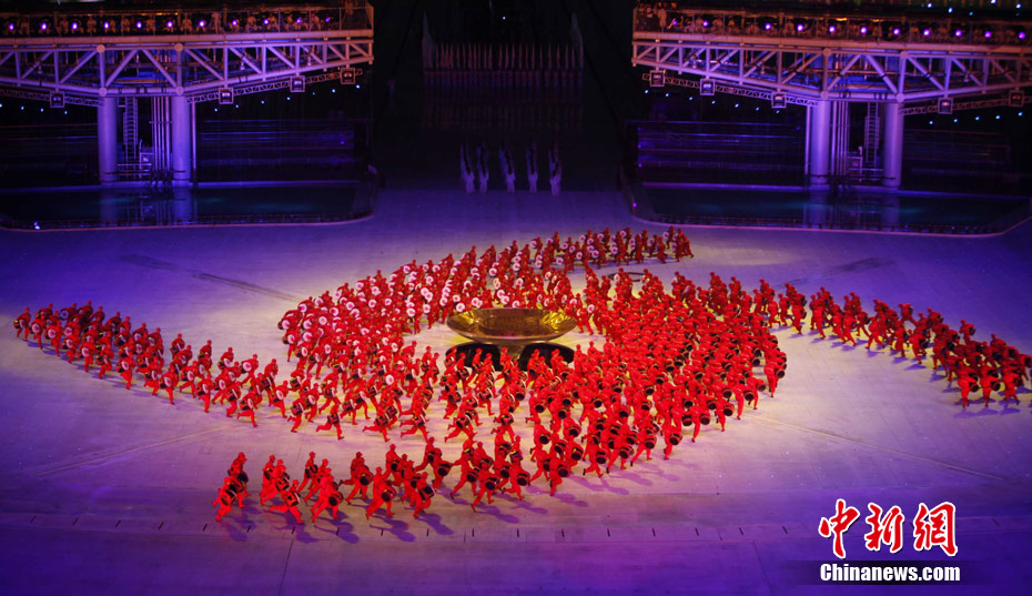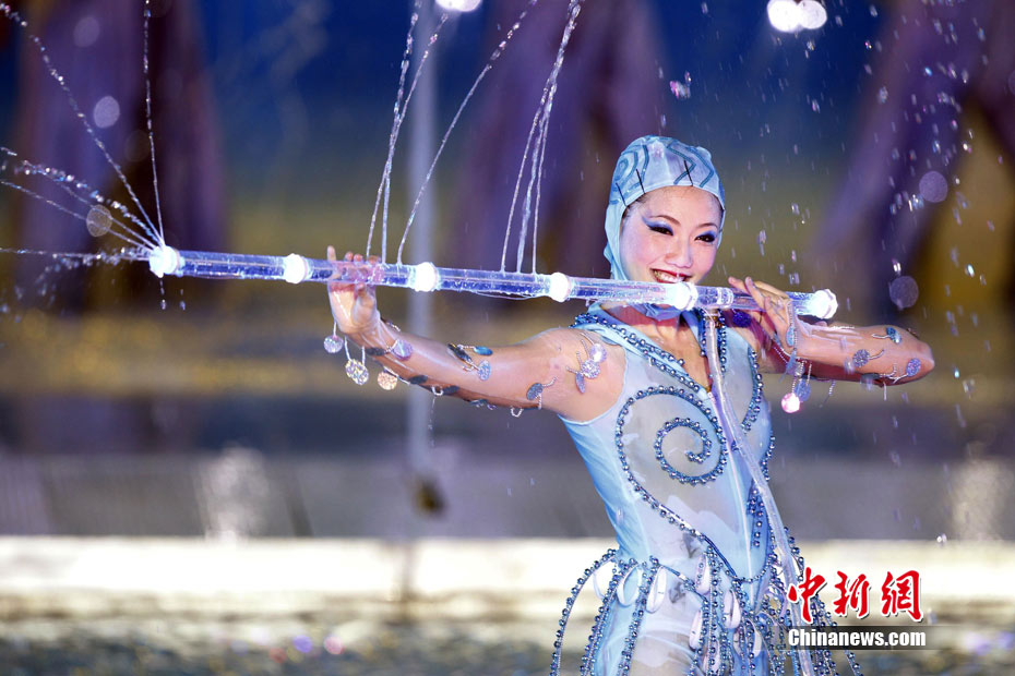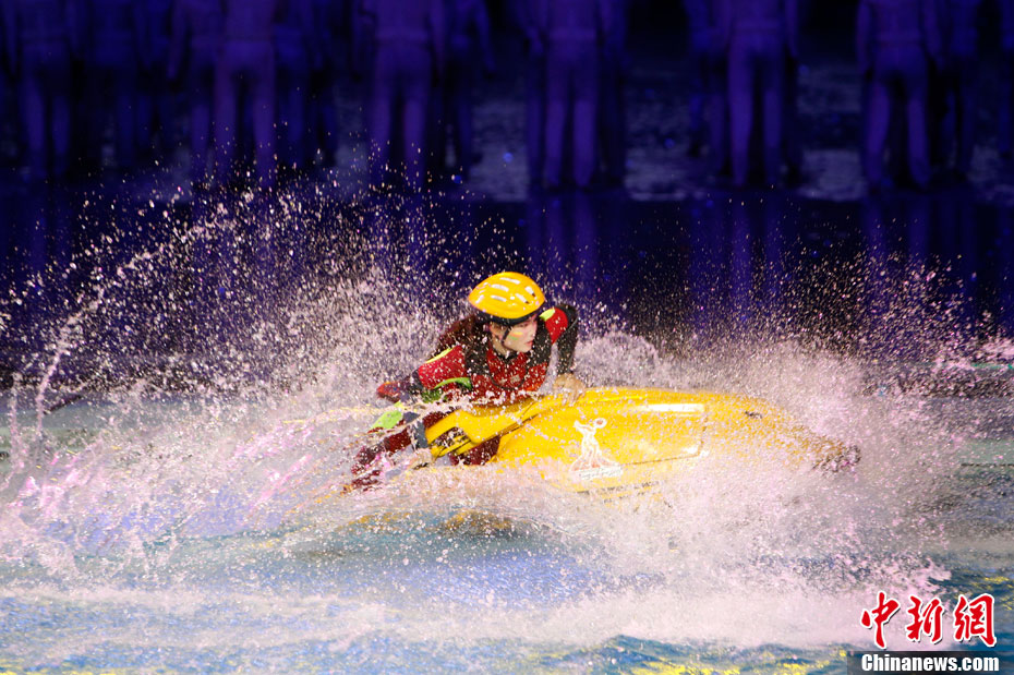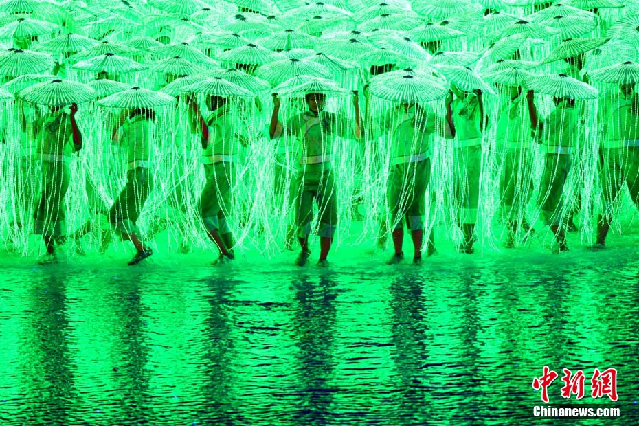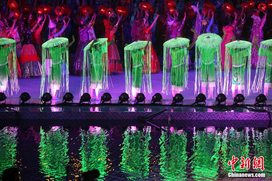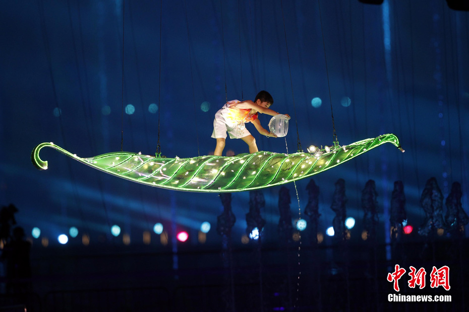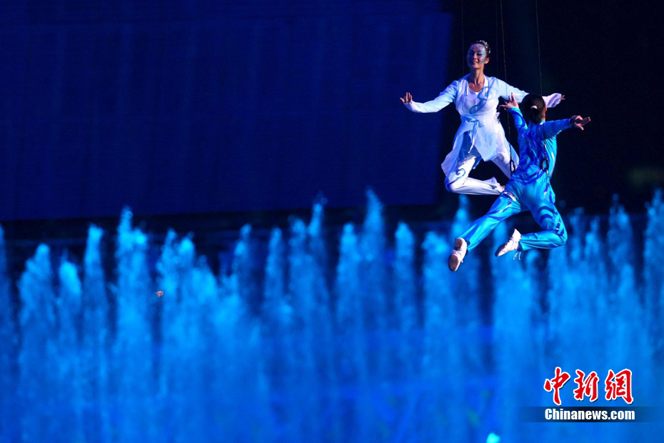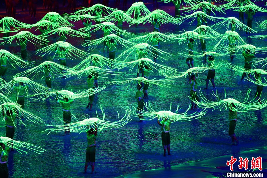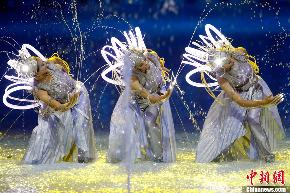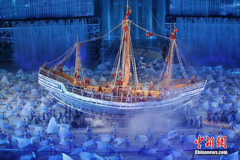 11月12日晚,第16屆亞運會開幕式在廣州海心沙舉行,宏大、絢麗的文藝匯演《啟航》給亞洲以及世界觀眾帶來藝術盛宴。水是廣州亞運開幕式最主要的創意元素,幕式的表演從一滴水到汪洋大海,從一葉扁舟到巨型帆船,從一汪情水到滔天巨浪。演員們用各種表演手段盡情展現水的魅力,表達水是生命之源、滋養萬物、呵護人類文明的精神內涵,令人嘆為觀止。中新社記者 杜洋 攝