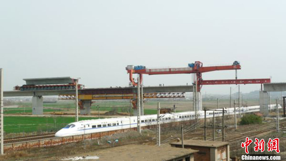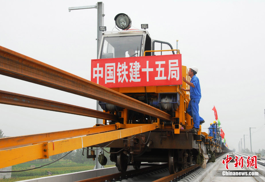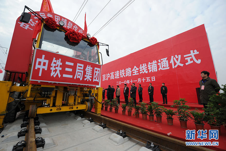 11月15日上午,隨著最后一根鐵軌在安徽蚌埠段順利鋪下,京滬高速鐵路全線完成鋪通工程,這是京滬高速鐵路建設取得的又一重大階段性成果。京滬高速鐵路的全線鋪通,標志著以線下工程和鋪軌為主的站前工程全部結束,下一步將全力推進以牽引供電、通信、信號、電力“四電集成”施工和站房建設為主的站后工程施工,展開全線聯調聯試。圖為15日,京滬高鐵先導段鋪通儀式在京滬高鐵蚌埠南火車站舉行。中鐵十五局員工在接軌點安裝最后一組鋼軌鎖定螺栓。(張智海 范剛軍 李紅)
