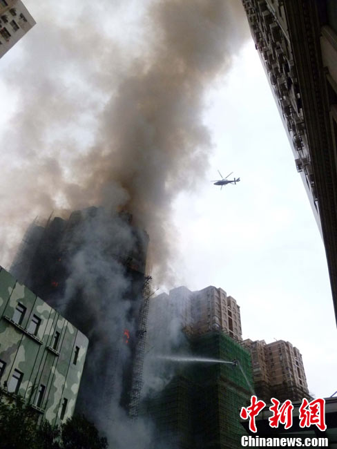 11月15日下午2時15分,上海中心城區(qū)靜安區(qū)正在進(jìn)行外墻裝修的教師公寓的腳手架起火,火警發(fā)生后,公安民警、消防隊員迅速趕往現(xiàn)場救援,到場消防車超過10輛。起火原因和損失狀況正在進(jìn)一步調(diào)查中。中新社發(fā) 張嘉森 攝