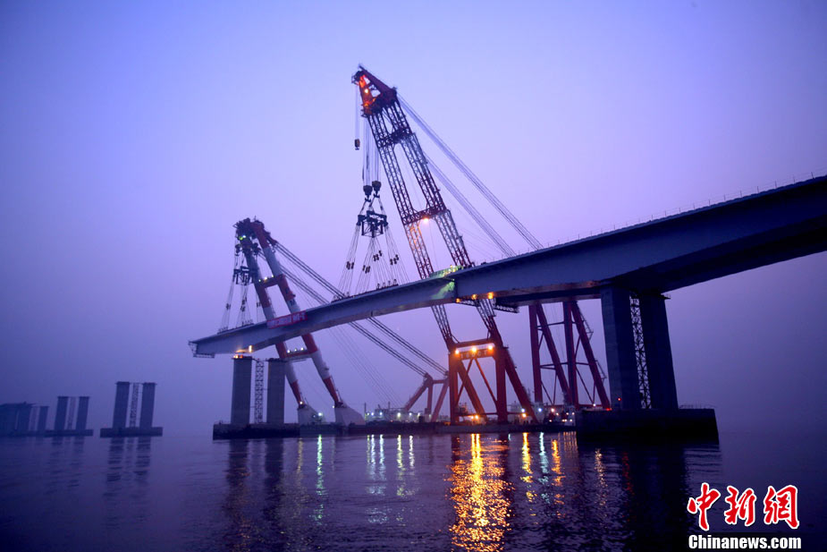 11月19日17時58分,堪稱“神州第一梁”的崇啟大橋首節185米鋼箱梁吊裝成功。崇啟大橋位于江蘇啟東和上海崇明島之間,長185米、寬16米的主橋變截面鋼箱梁精確吊放標志著崇啟大橋施工難度最大、技術最復雜、安全風險最高的吊裝工程取得關鍵性勝利,創造了國內橋用鋼箱梁架設在單節起吊規模上的新記錄。 中新社發 崇啟橋指 供圖