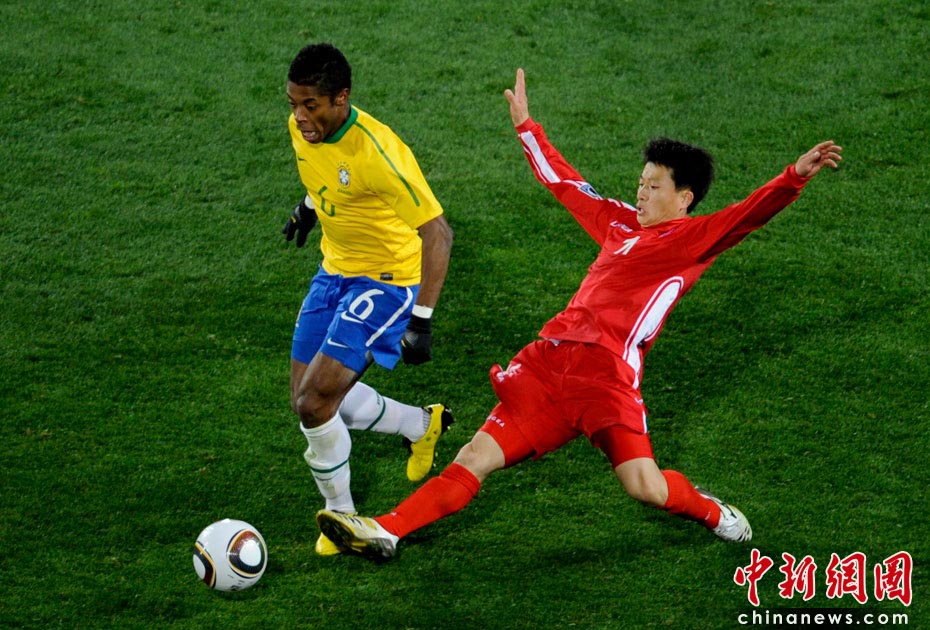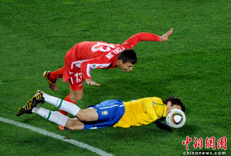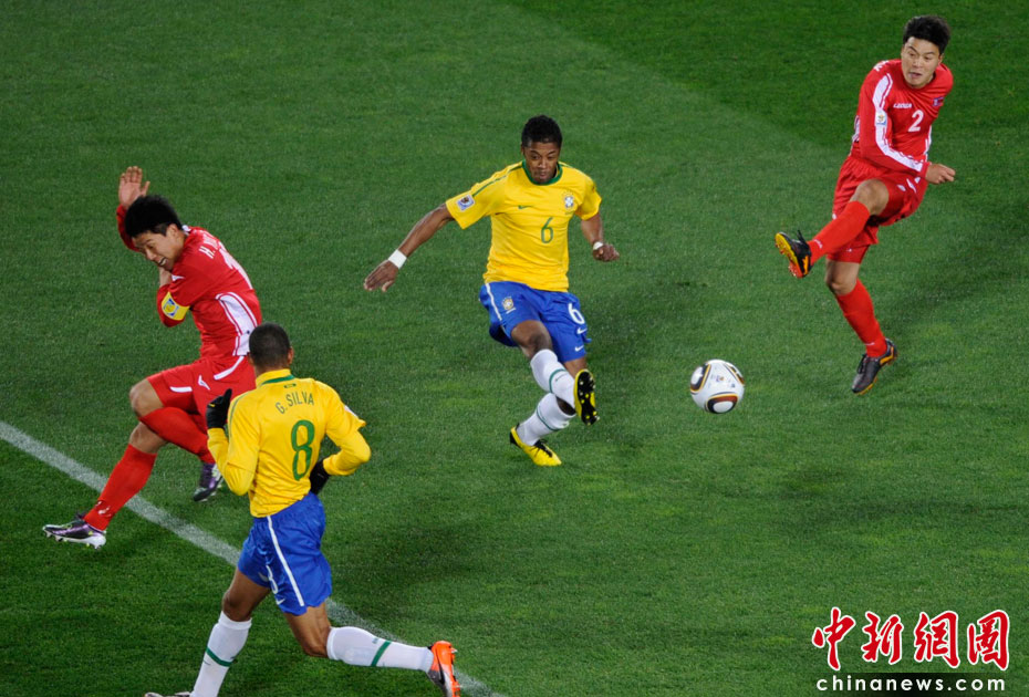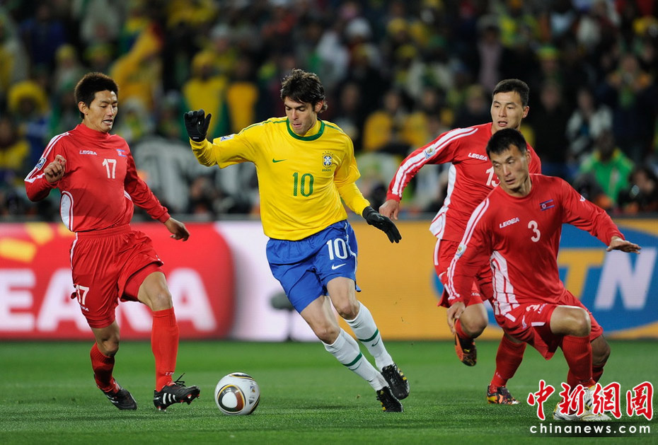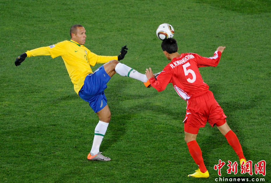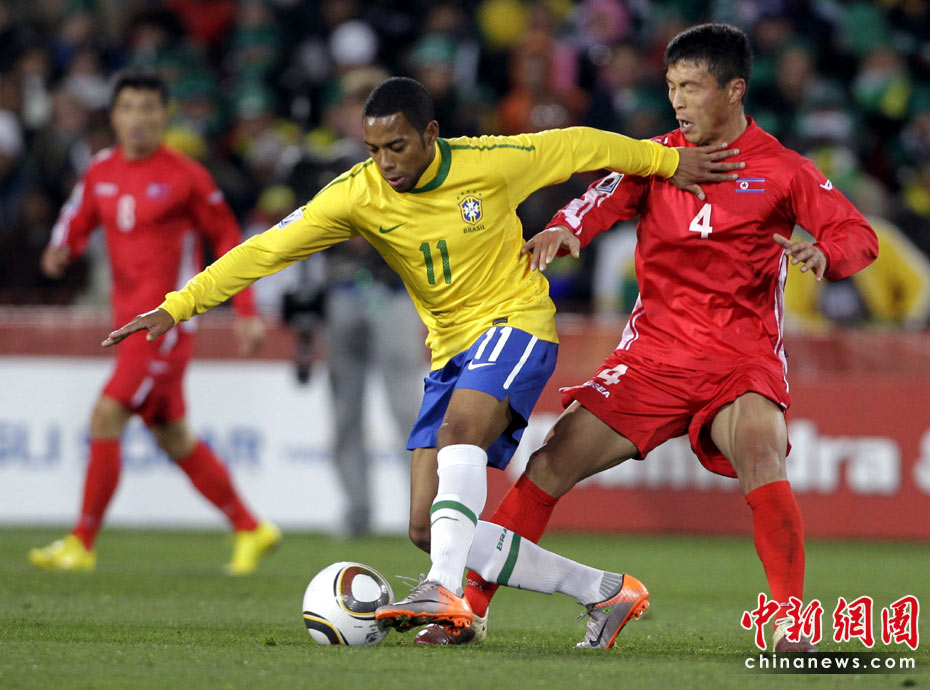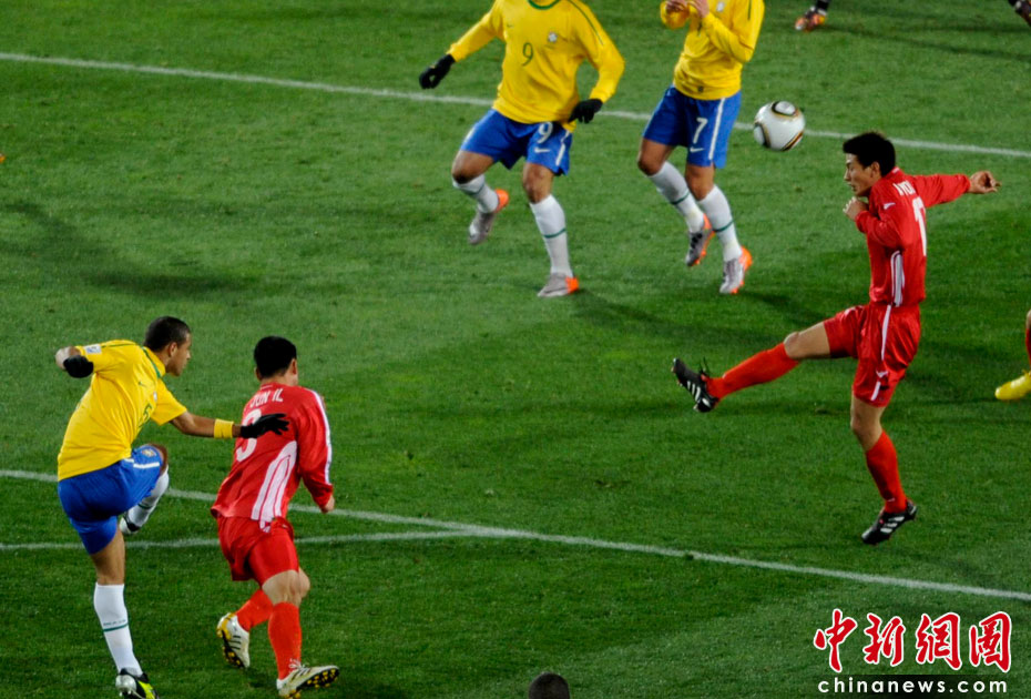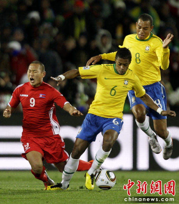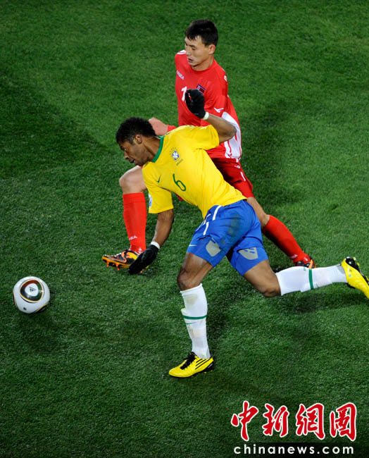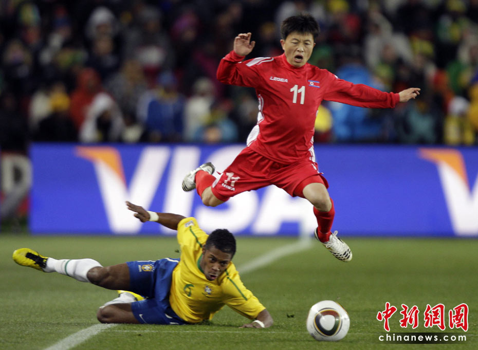 北京時間6月16日凌晨2:30進(jìn)行的一場世界杯小組賽G組的較量中,巴西隊迎來了朝鮮隊。最終經(jīng)過90分鐘激戰(zhàn),巴西隊2-1擊敗朝鮮,贏得南非世界杯開門紅。中新社記者 廖攀 攝