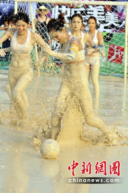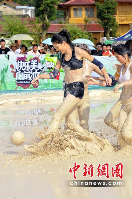 南非世界杯戰(zhàn)火越燃越烈,各地的世界杯熱潮也席卷而來。近日,一檔比基尼美女足球賽在長沙開鑼,和世界杯男足不同的是,美女們是在泥漿中比賽。據(jù)悉,這檔名為《快樂美美向前沖》的足球賽已在湖南經(jīng)視播出。節(jié)目中,為了順利闖關,眾美女不顧形象,在泥漿中匍匐前進和翻滾,引得觀眾爆笑如雷。圖為首場比賽中,湖南隊美女與湖北隊美女在連闖四關后,進入泥漿場內進行終極球賽PK。湖南經(jīng)視供圖