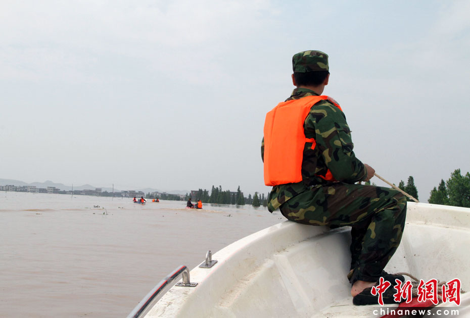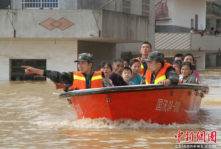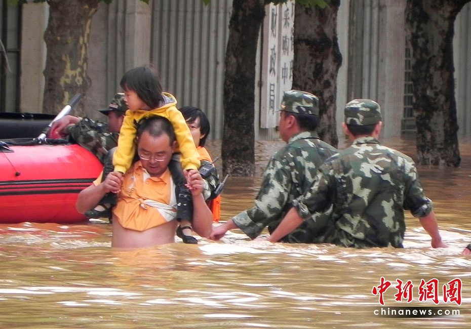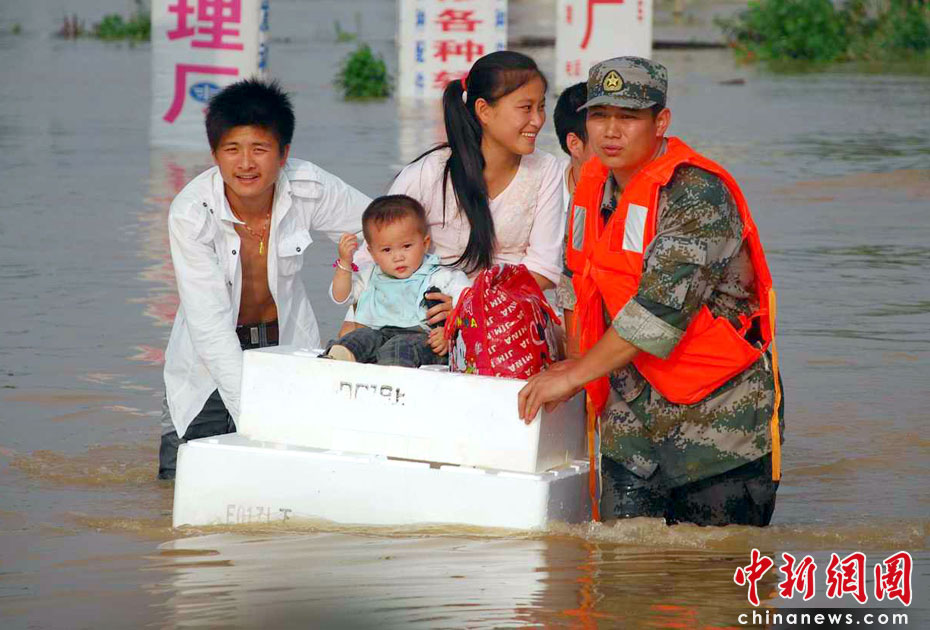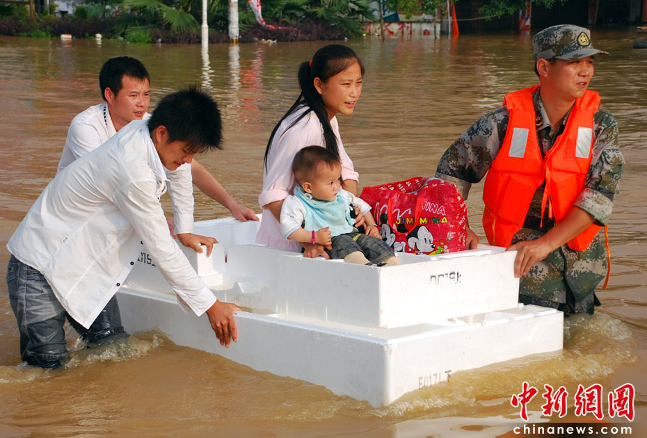 江西第二大河流撫河干流發生超歷史洪水,撫河唱凱堤21日傍晚決口,嚴重威脅下游5個鄉鎮14.5萬人口的安全。南京軍區戰士和群眾一起解救被洪水圍困的婦女和小孩,泡沫箱成了“生命小舟”。何柳斌 攝
