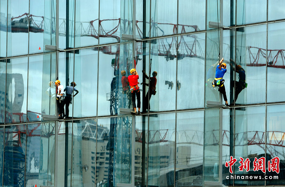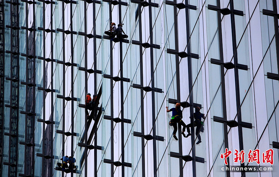 當(dāng)?shù)貢r(shí)間6月23日,21名專(zhuān)業(yè)登山者參加了在新加坡舉行的首屆世界攀登高塔錦標(biāo)賽。21位專(zhuān)業(yè)登山者同時(shí)攀爬3座55層樓高的濱海灣金沙酒店,最先爬到樓頂者為勝。
