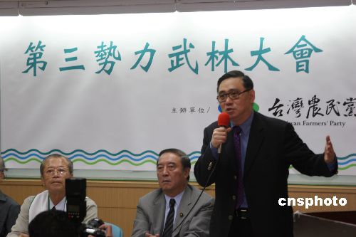 臺灣弱勢政黨十月二十五日在臺北召開“第三勢力武林大會”,呼吁“人民生計擺中間,政黨惡斗放兩邊”,宏仁集團董事長王文洋(右一)在會上發言時大聲問到:“全世界都認為中國大陸的市場非常重要,我們臺灣為什么不與大陸直航?為什么自己捆手捆腳?”中新社發 耿軍 攝