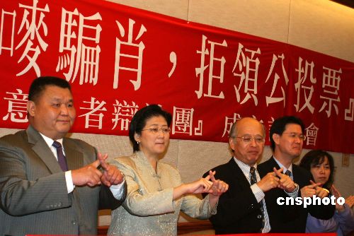 十二月十日,臺灣民間團體“民主行動聯盟”在臺北舉行記者會,宣布由十多位學者、名嘴組成“入、返聯公投”反方意見辯論團。“民主行動聯盟”總召集人黃光國教授(左三)并呼吁民眾,為了擺脫民粹政治、不激化兩岸關系,拒領“入、返聯公投”票。中新社發 董會峰 攝
