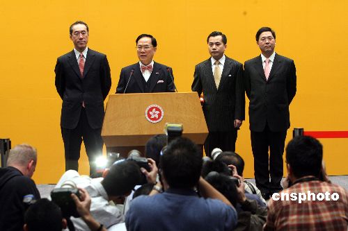 十二月二十九日,香港特別行政區(qū)行政長官曾蔭權在政府總部會見新聞界,政務司司長唐英年、律政司司長黃仁龍和政制及內地事務局局長林瑞麟等一同出席。中新社發(fā) 武仲林 攝