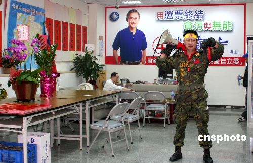 一月十一日,臺灣第七屆“立委”選舉進入最后沖刺階段。圖為在臺北市西園路的一名“立委”候選人競選總部內,身著戎裝的支持者正準備出發去掃街拜票。中新社發 陳立宇 攝
