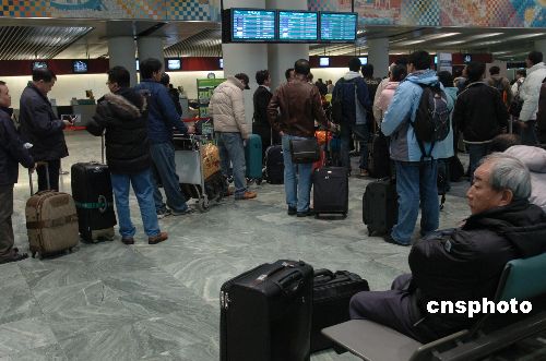 二月三日,澳門國際機場辦理登機手續處排起了長隊。春節期間,澳門航空公司加開三十四個航班,分別為杭州兩班,上海十二班,臺北八班和東京包機十二班,以滿足市場需求。中新社發 史利 攝