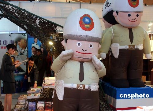 2月中旬,臺北國際書展今年首設“軍事圖書區”,二十五家軍事出版社及臺灣軍事管理部門參展。由“阿兵哥”扮裝的“憲兵娃娃”吸引民眾駐足,意外成為書展熱點。中新社發 耿軍 攝