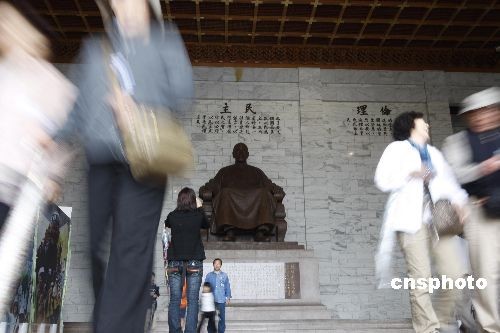 4月1日,因更名引發(fā)爭議的臺北“中正紀念堂”蔣介石銅像大廳懸掛的風箏已經拆除,目前剩下大廳中央的鋼架以及兩側的布幕尚未撤除。圖為游客參觀“中正紀念堂”蔣介石銅像大廳。中新社發(fā) 杜洋 攝