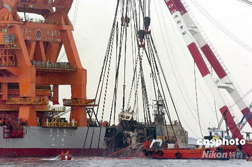 四月二十七日,由中國交通部廣州打撈局派出的大型打撈船“華天龍”,在香港水域小磨刀東面,成功將沉沒的烏克蘭補給船的煙囪及駕駛艙部份吊出水面。中新社發 鄧慶樂 攝