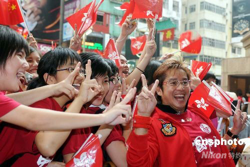 五月二日中午,香港紅星譚詠麟出席時代廣場舉行的“全民迎圣火 中國加油”慶祝活動,與市民一起見證奧運圣火在香港的傳遞。中新社發 蔡蔓莉 攝