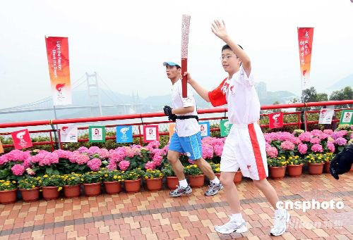 五月二日,奧運圣火在香港傳遞,手持北京奧運火炬的香港最年輕火炬手趙頌熙經過香港地標青馬大橋。中新社發 洪少葵 攝