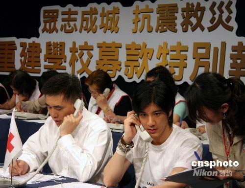 十七日,臺灣一電視臺與香港電視臺聯線舉辦“眾志成城抗震救災重建學校募款特別報道”,協助四川震災過后學校重建。圖為臺北市市長郝龍斌與歌手王力宏加入募款行列,擔任捐款專線接線志工,共襄義舉。中新社發 劉舒凌 攝