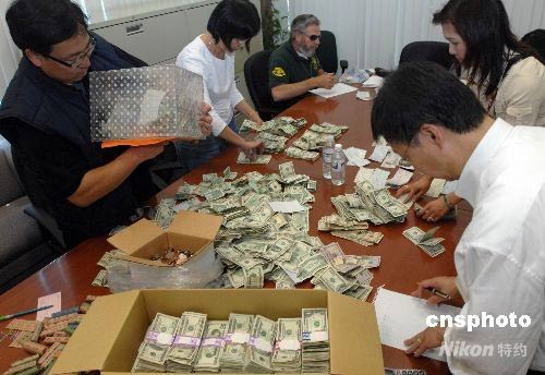 當(dāng)?shù)貢r(shí)間五月十七日,四川大地震發(fā)生后的第一個(gè)周末,在洛杉磯地區(qū)工作生活的普通華人華僑頂著華氏一百度的高溫走上街頭,為遠(yuǎn)隔萬里的災(zāi)區(qū)同胞默默捐出一張張現(xiàn)金和支票。短短六個(gè)小時(shí)的街頭募捐活動(dòng)共籌得四十萬美元。圖為羅省中華總商會(huì)會(huì)長(zhǎng)莊佩源(左一)等人正在清點(diǎn)部分捐款。中新社發(fā) 張煒 攝