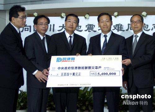 五月十九日,香港民建聯通過中聯辦向四川地震災區捐款五百四十萬元港幣。民建聯主席譚耀宗(右三)及中聯辦副主任彭清華(右二)等出席儀式。中新社發 譚達明 攝