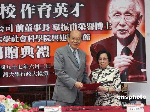 六月二日,辜振甫的遺孀辜嚴(yán)倬云替他完成遺愿,捐贈臺灣大學(xué)社會科學(xué)院興建圖書館。圖為臺灣大學(xué)校長李嗣涔向辜嚴(yán)倬云致贈感謝狀。中新社發(fā) 耿軍 攝