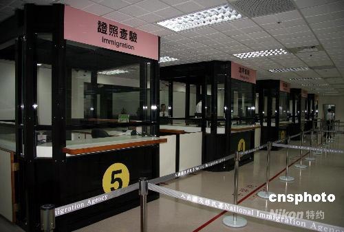 兩岸周末包機將于七月四日啟程,臺北松山機場當日到港四班。為因應周末包機需要,松山機場在二十多天時間內,基本完成了機場整修。圖為裝修一新的證照查驗通道。中新社發 徐長安 攝
