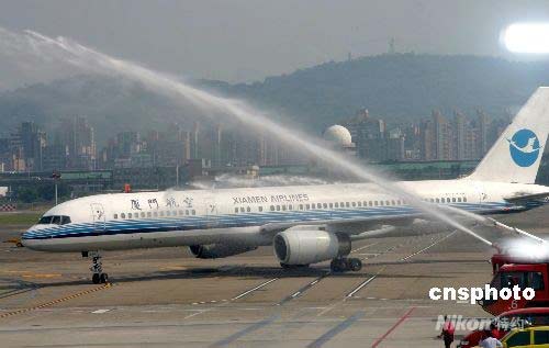 七月四日八時三十八分,兩岸周末包機大陸福建首發團乘坐廈門航空公司B757客機抵達臺北松山機場。松山機場以噴水儀式為首發團接風洗塵。中新社發 徐長安 攝