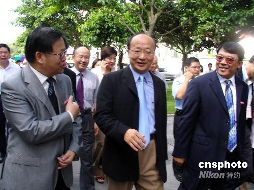 七月五日上午,臺中市市長胡志強(中)到廈門大學參訪。圖為廈門大學黨委書記朱之文(右)、廈大校長朱崇實(左)陪同他參觀校園。中新社發 楊伏山 攝