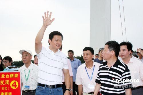 7月5日,大陸居民赴臺(tái)旅游首發(fā)團(tuán)抵臺(tái)第二天。臺(tái)北縣長(zhǎng)周錫瑋專程來到臺(tái)北縣古鎮(zhèn)淡水,對(duì)大陸游客表達(dá)歡迎,并親自為來自福建的旅游團(tuán)導(dǎo)覽淡水風(fēng)光漁人碼頭、情人橋等。中新社發(fā) 黃少華 攝