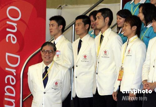 七月六日下午,中國國家副主席習近平在香港沙田奧運馬術場地接見奧運香港運動員代表和義工,并鼓勵他們為奧運出力,為祖國爭光。習近平副主席的加油打氣后,香港奧委會會長霍震霆(左一)及運動員和義工們個個臉上喜氣洋洋,精神倍增。中新社發 王麗南 攝