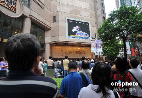 九月二十七日,中國“神舟七號”航天員翟志剛歷史性作漫步太空,成為中國航天事業的新里程碑。在香港銅鑼灣時代廣場的大型戶外電視屏幕下,眾多市民駐足觀看電視直播。圖為航天員翟志剛漫步太空期間并揮動國旗,以及收集飛船外的太空實驗樣本。中新社發 鄧慶樂 攝