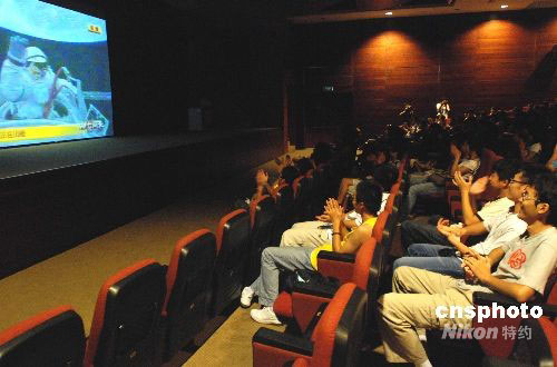 二十七日下午四時許,兩三百名澳門科技大學(xué)師生在學(xué)校禮堂收看“神舟七號”航天員出艙活動電視直播,不斷為中國航天員喝彩。中新社發(fā) 畢永光 攝