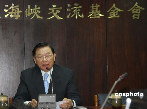 10月21日中午,臺灣海基會董事長江丙坤召開臨時記者會,譴責暴力襲擊來臺灣進行學術訪問的海協會副會長、廈門大學傳播學院院長張銘清。中新社發 耿軍 攝