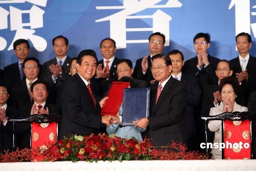 十一月四日,海協(xié)會(huì)與海基會(huì)在臺(tái)北圓山飯店舉行歷史性的會(huì)談后,大陸海協(xié)會(huì)會(huì)長陳云林與臺(tái)灣海基會(huì)董事長江丙坤下午十四時(shí)許在臺(tái)北就兩岸海運(yùn)、空運(yùn)、郵政、食品安全等議題簽署四項(xiàng)協(xié)議。中新社發(fā) 洪少葵 攝