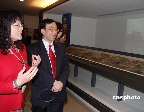 2月26日,上海博物館館長陳燮君(中)一行應邀抵達臺北參訪。圖為陳燮君一行在臺北故宮參觀,聽工作人員介紹結合了聲光效果的《清明上河圖》復制品。中新社發 路梅 攝