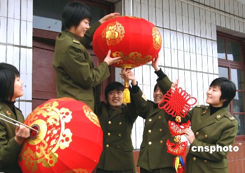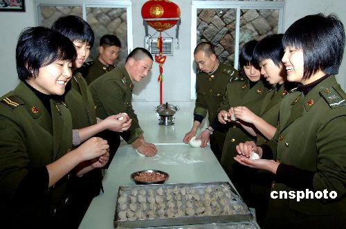 2月5日,駐閩某部女兵在軍營營房前高掛大紅燈籠,在軍營食堂包餃子,喜迎新春佳節(jié)的到來。中新社發(fā) 劉可耕 攝