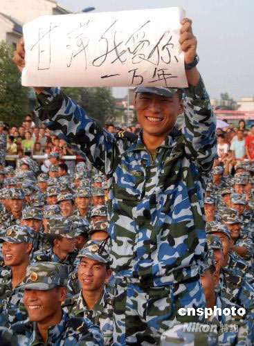 6月1日傍晚,海政文工團(tuán)著名演員宋祖英、呂繼宏、甘萍、呂薇、閆學(xué)晶、霍勇、姚貝娜等來(lái)到四川什邡市師古鎮(zhèn),慰問(wèn)奮戰(zhàn)在抗震救災(zāi)一線的海軍陸戰(zhàn)隊(duì)的勇士們。演員們的出現(xiàn),讓奮戰(zhàn)了半個(gè)月的官兵們心情頓時(shí)開(kāi)朗,露出久違的笑容。中新社發(fā) 姚澤勇 攝